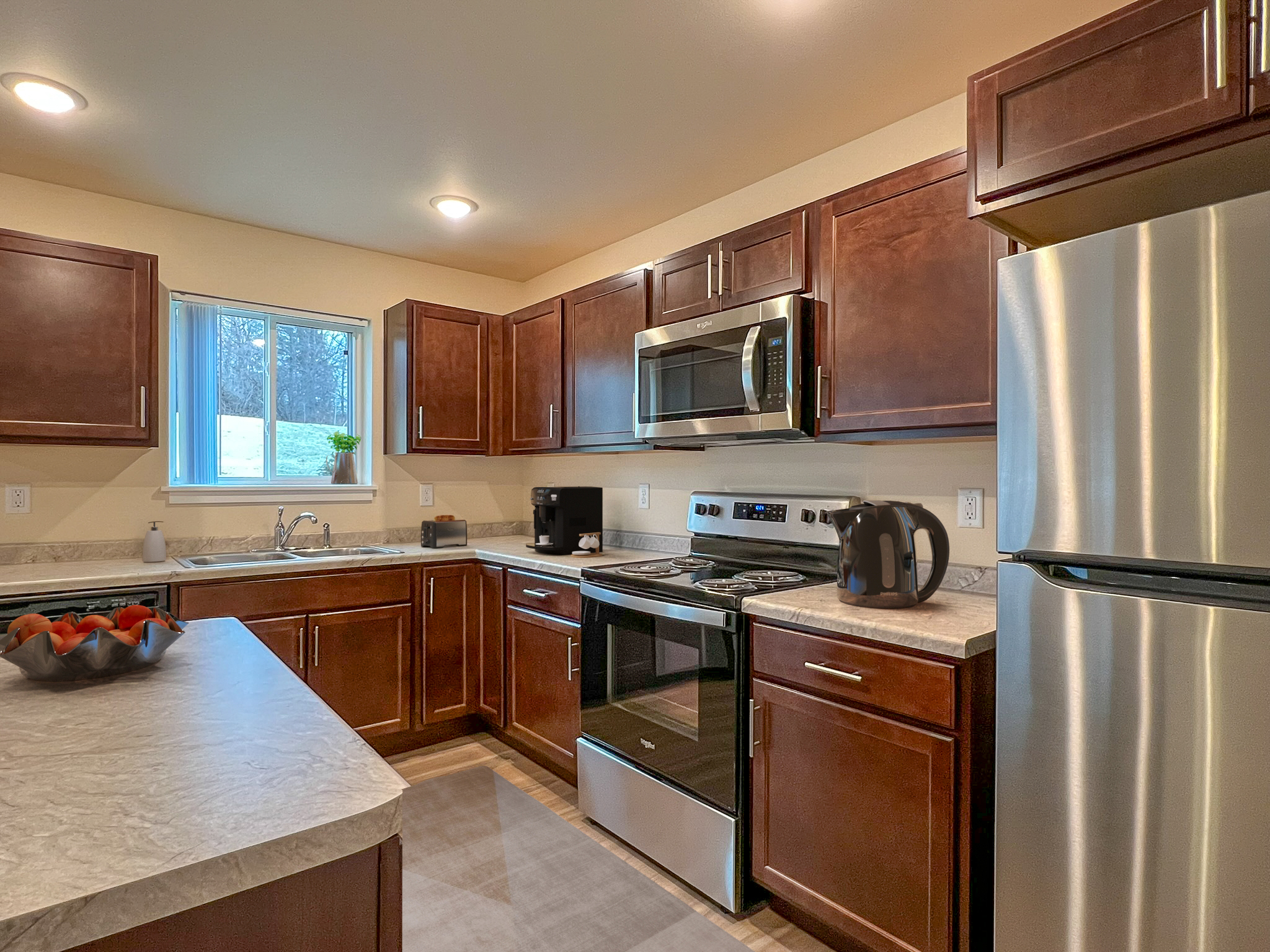 Discover modern living in this beautifully updated 2-bedroom, 1.5-bathroom contemporary home, offering a spacious 1,360 sq ft of inviting atmosphere. The heart of this residence is an impressive U-shaped kitchen, featuring sleek dark wood shaker cabinetry, stainless steel appliances, and light speckled laminate countertops, all complemented by a charming window view above the sink. This culinary space flows seamlessly into the open-concept dining and living areas, adorned with stylish LVP flooring, neutral walls, and recessed lighting, creating an ideal setting for both entertaining and daily relaxation. Each spacious bedroom provides a serene retreat