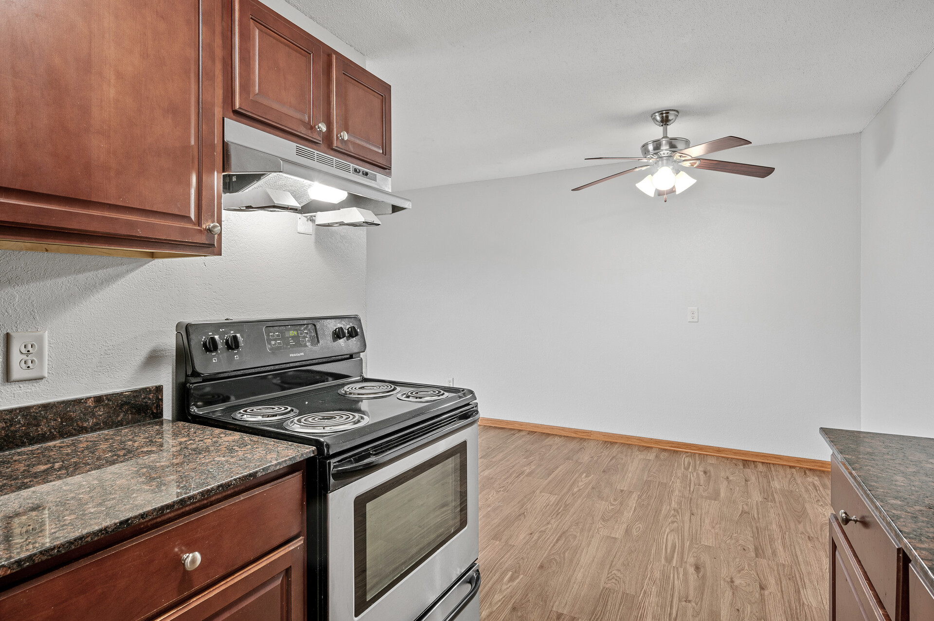 Discover elevated living at this beautifully renovated 2-bedroom, 1-bathroom residence spanning 1,050 square feet. Step inside to find a thoughtfully updated space featuring sleek wood-look LVP flooring, plush grey carpeting, and neutral white walls that create a bright, welcoming ambiance. The modern kitchen is a chef's delight, boasting dark wood shaker cabinetry, gleaming granite countertops,