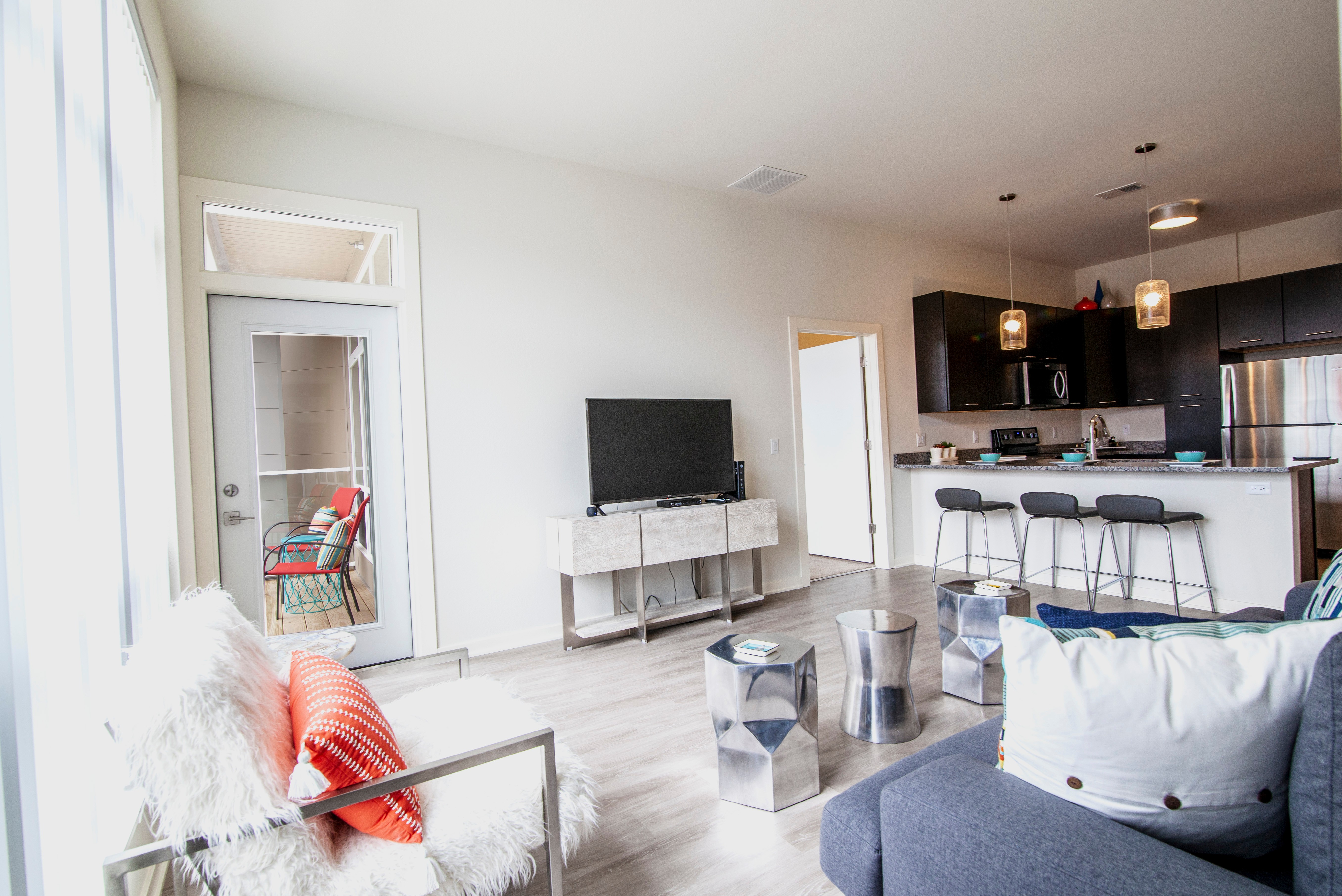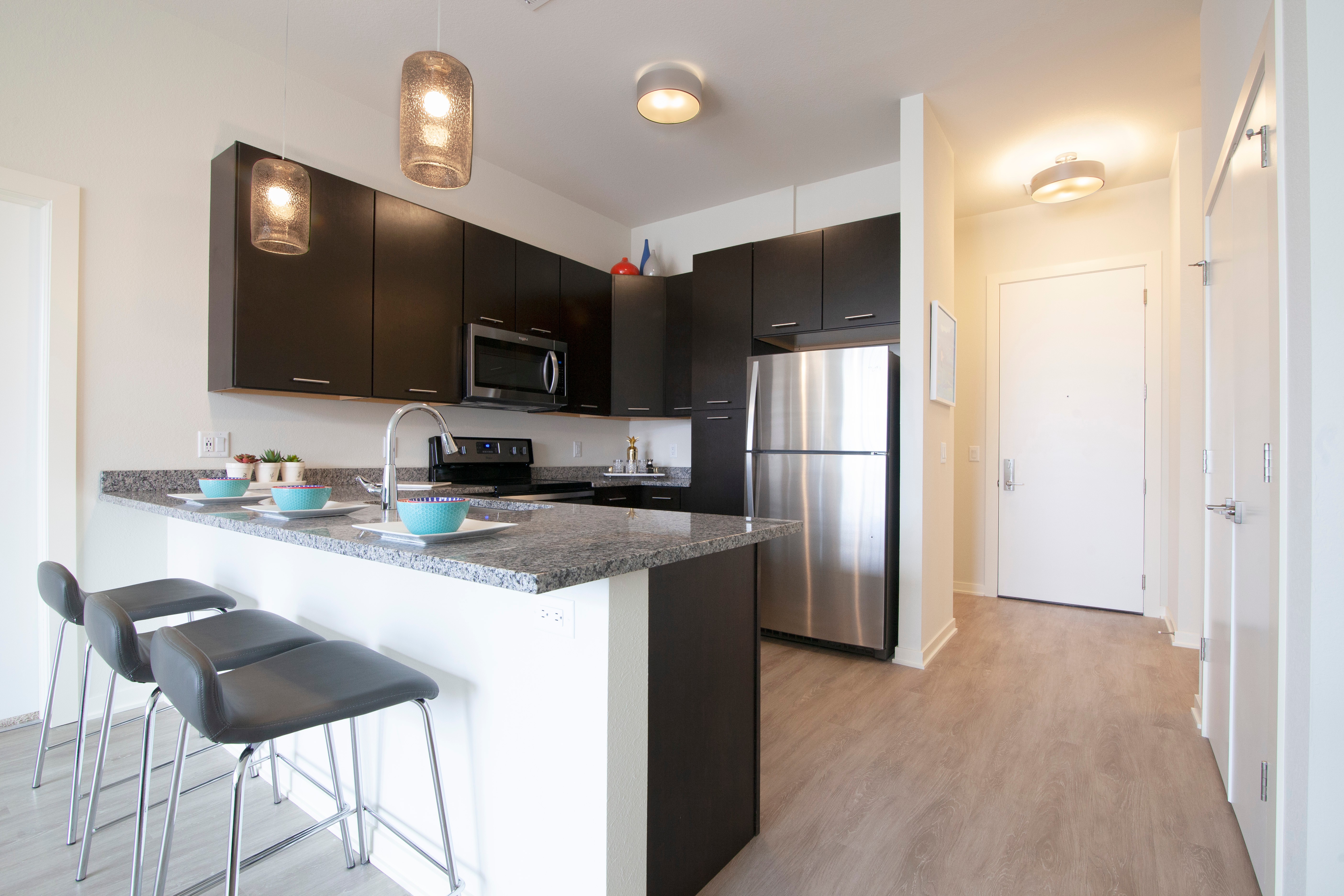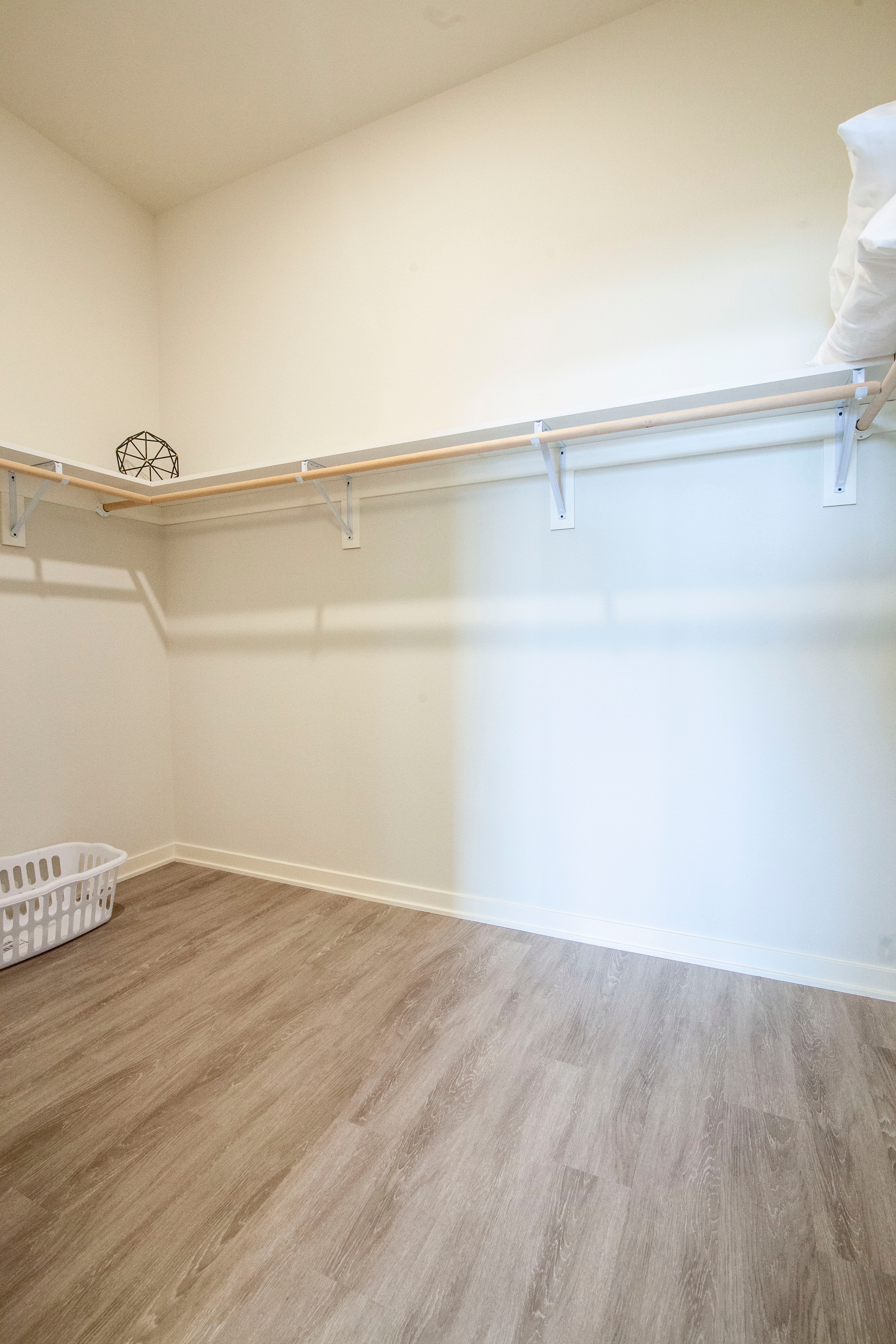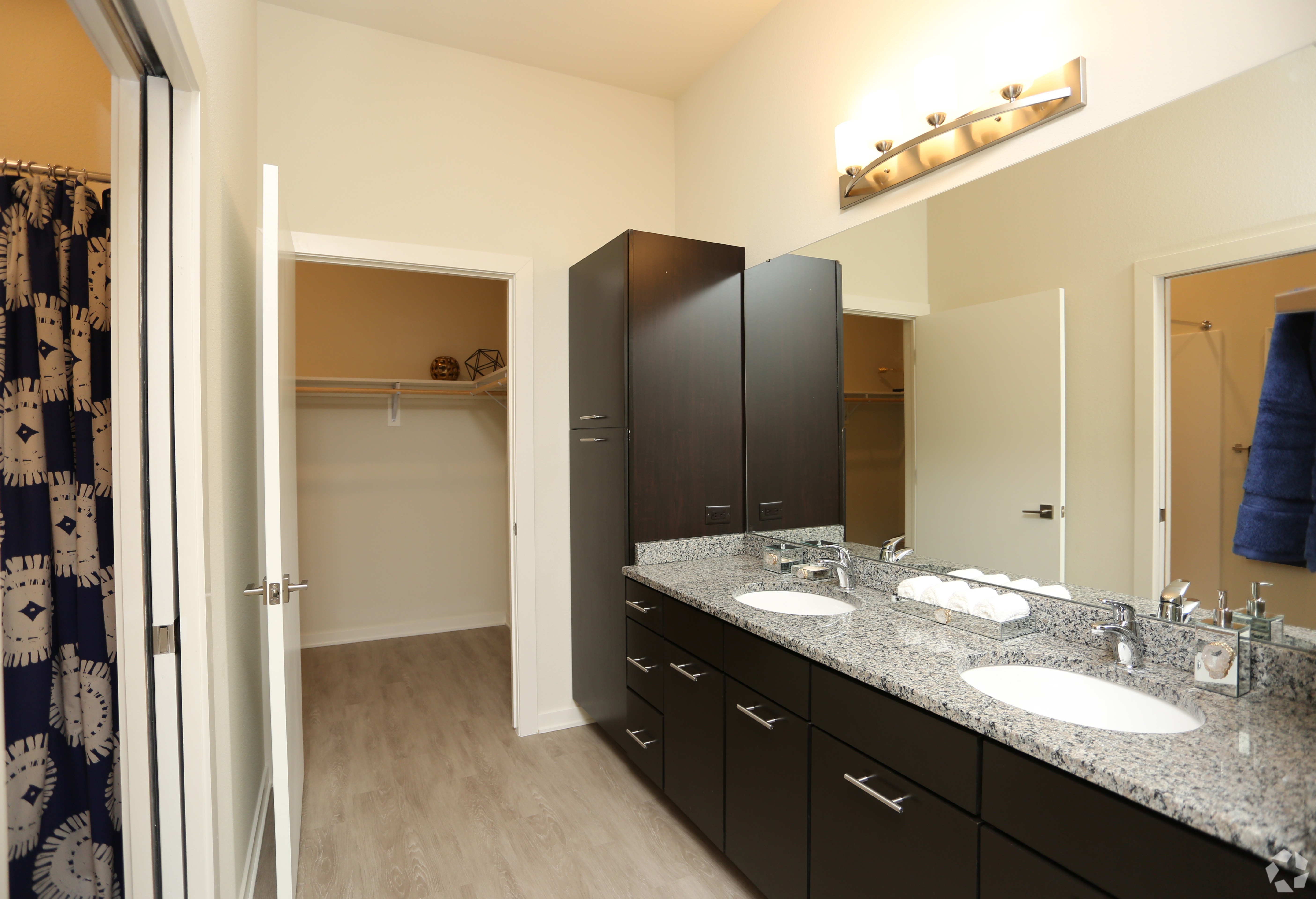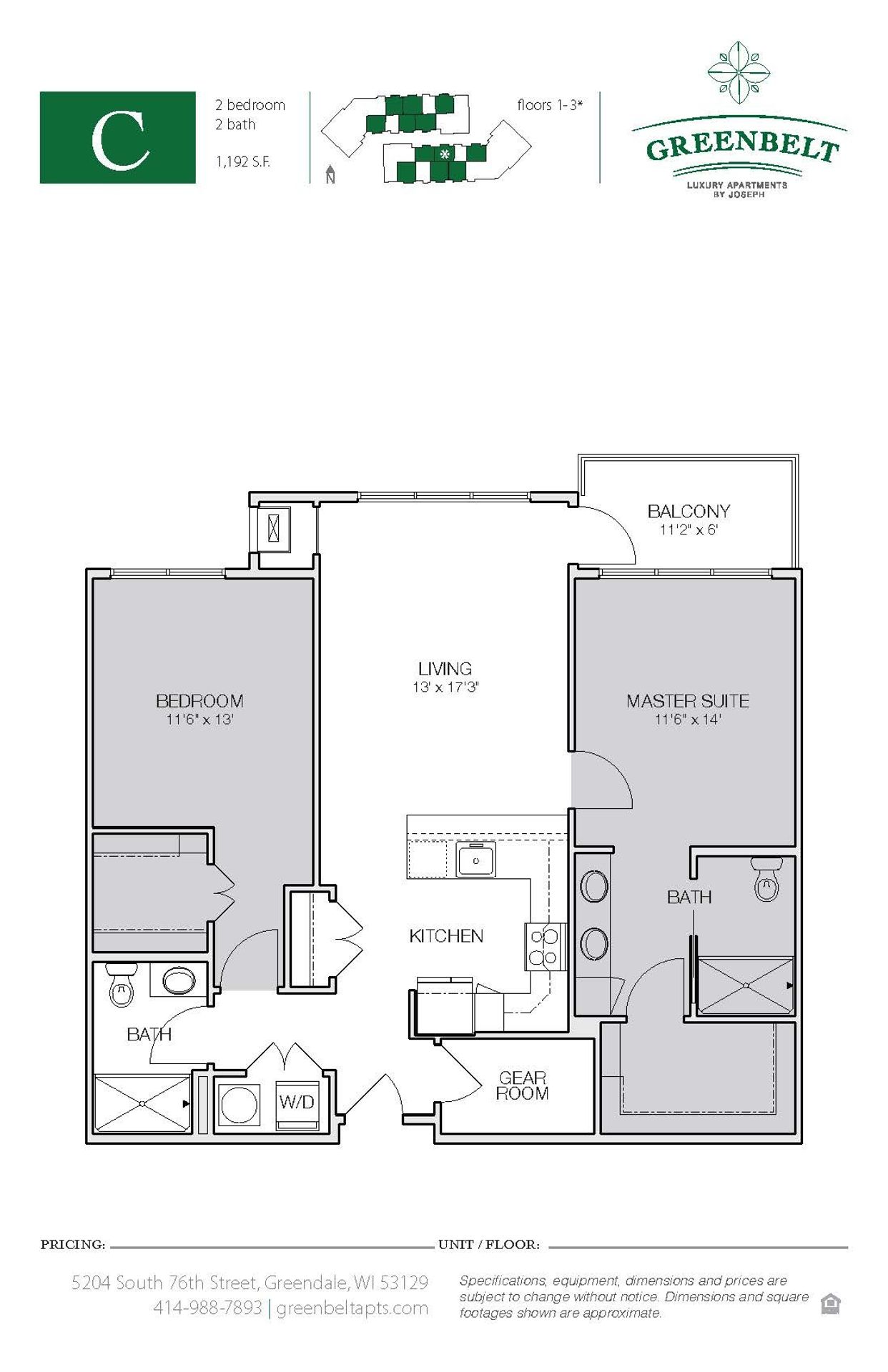 Greenbelt Apartments - Floor Plan C (Phase I) This stunningly spacious 2-bedroom apartment home offers a fantastic open-concept layout. A large balcony, floor-to-ceiling windows, fantastic walk-in closets, and spectacular master suite make this apartment our favorite 2-bedroom! When you walk in the front door, you'll see plenty of storage solutions: a large coat closet and spacious gear room for in-home storage. The in-home washer and dryer is energy efficient and full-size. The large gourmet kitchen offers plenty of cabinet space with a built-in pantry and ample custom cabinets. The modern granite counters provide plenty of cooking and prep space, well-lit with custom pendant lighting over your long kitchen island. Your living room will be light and bright with floor-to-ceiling windows and a glass door leading to your private balcony. Extra tall 10-foot ceilings make this space feel even bigger! The master suite is out of this world! A hotel-style configuration offers double sinks with an enormous vanity and built-in linen closet. The large walk-in shower and toilet are set apart for privacy with a sleek pocket door. The master suite has a walk-in closet so large, you could use it as a den! The ample hanging space and custom shelving are unparalleled. The second bedroom doesn't fail to impress either. It features a huge walk-in closet with plenty of storage space and floor to ceiling windows. The second bathroom is conveniently located next to the bedroom, featuring a walk-in shower and vanity with ample storage space.