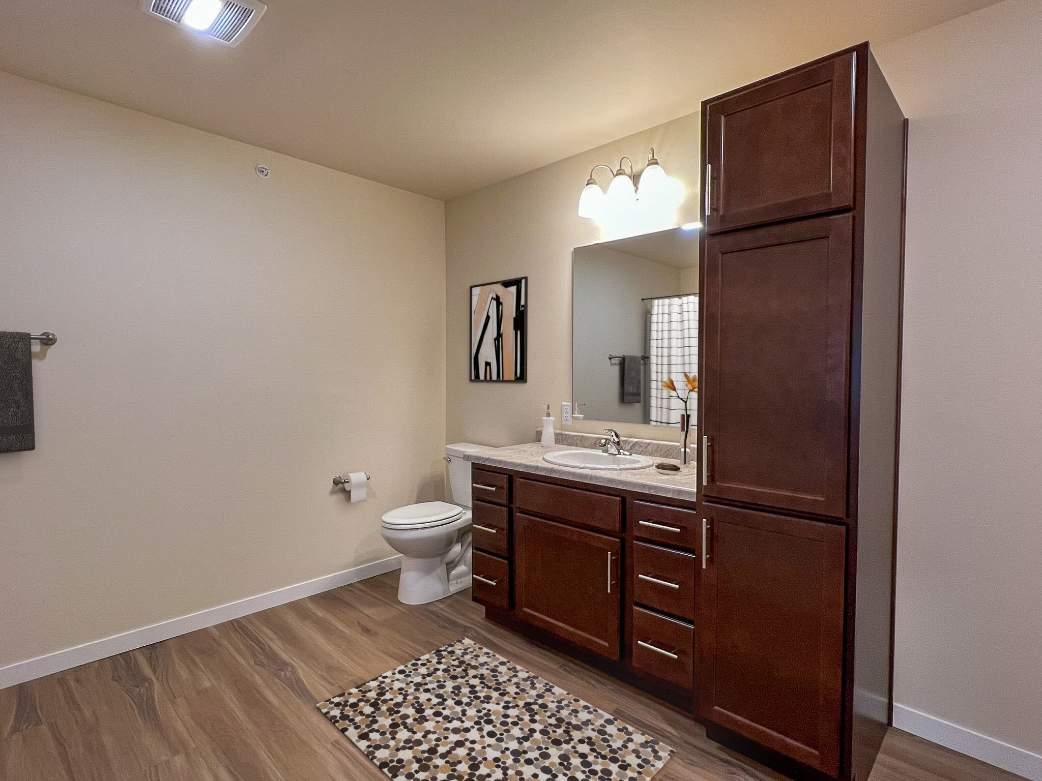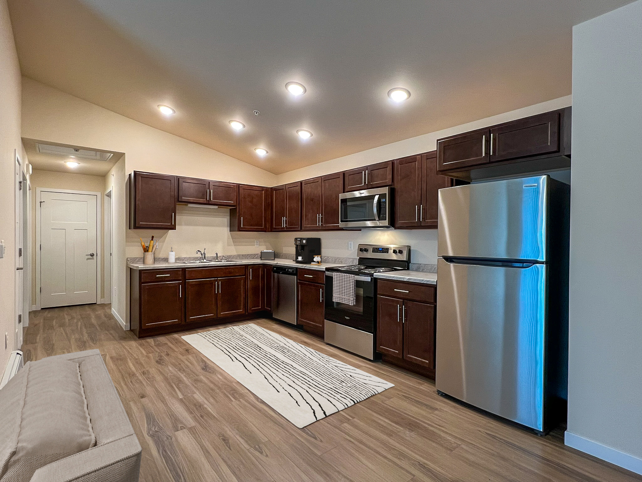 Discover contemporary living in this beautifully updated 2-bedroom home, designed for comfort and modern style. Step inside to an inviting open-concept living area, where a vaulted ceiling amplifies the sense of space and natural light pours in through a sliding glass door leading to your private balcony. Wood-look LVP flooring extends throughout, complementing the neutral